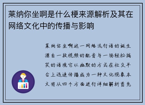 莱纳你坐啊是什么梗来源解析及其在网络文化中的传播与影响