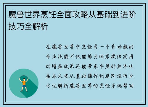 魔兽世界烹饪全面攻略从基础到进阶技巧全解析