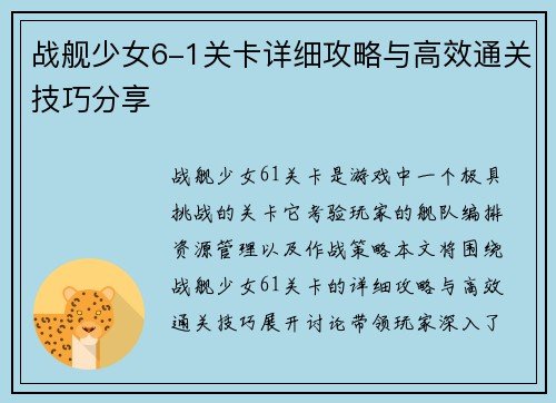 战舰少女6-1关卡详细攻略与高效通关技巧分享